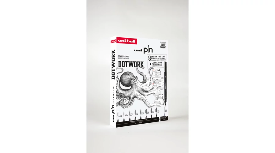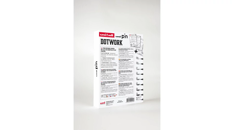 Merev, könyvszerű dekoratív tároló dobozban 8db Uni Pin rajzmarker és 1db Uni Shalaku S töltőceruza található. A termékeken felül 4 rajzlecke is megtalálható a csomagban, mely lépésről lépésre bemutatja, hogyan készíthetünk pontozásos technikával rajzokat.