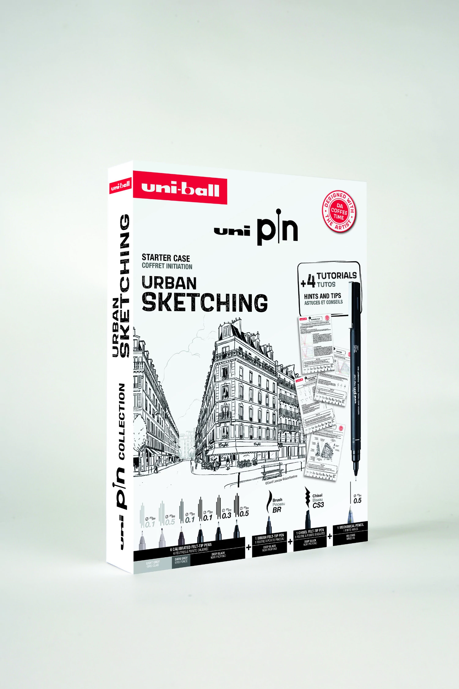 - URBAN SKETCHING COLLECTION box (8db PIN rajzmarker, egy mecahnikus ceruzát és útmutatót tartalmaz)